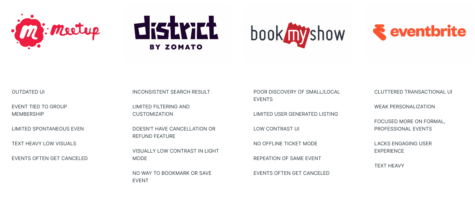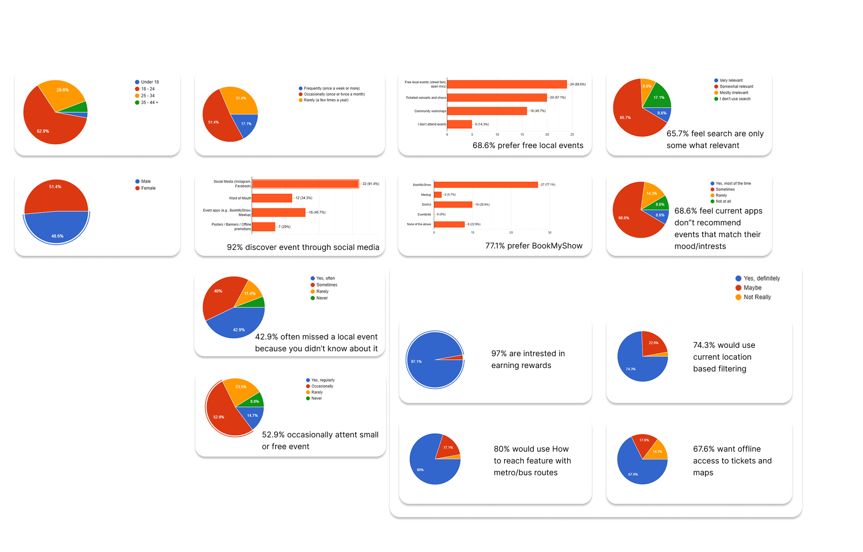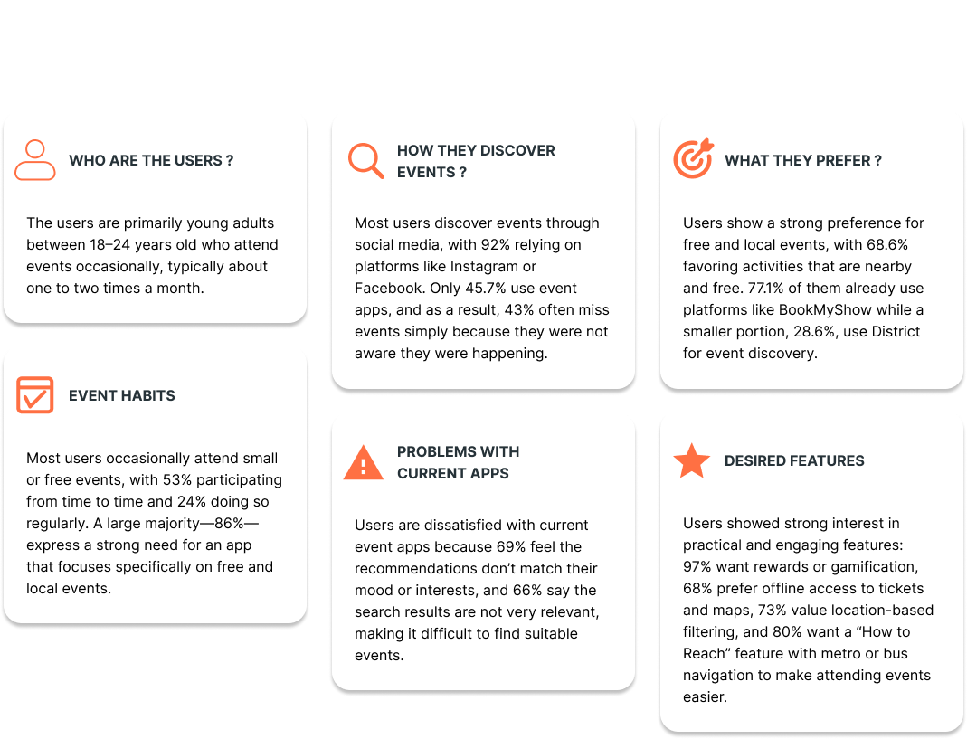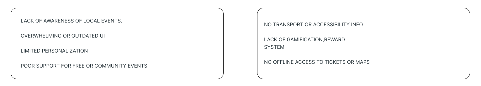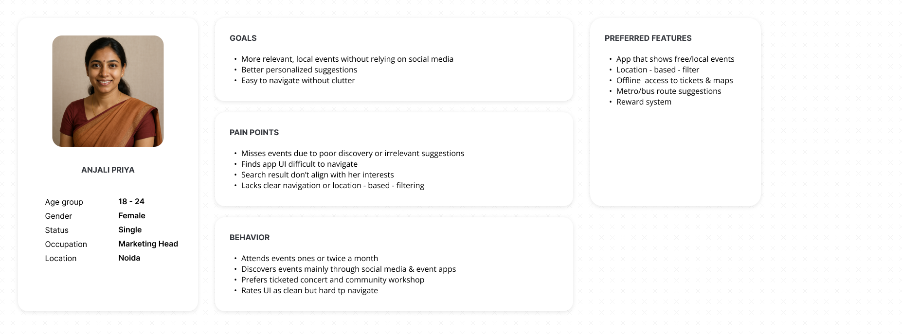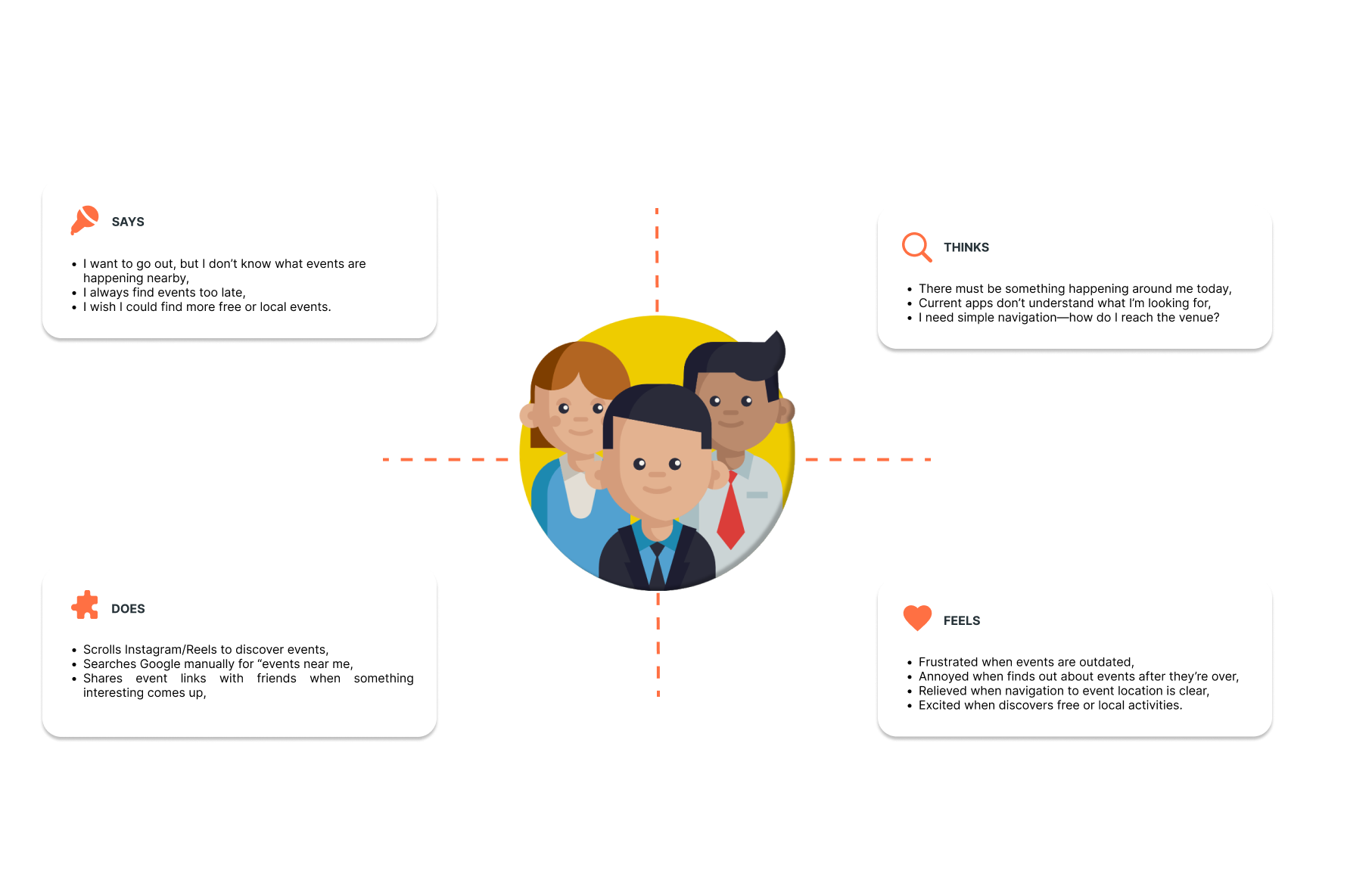 I understand the feelings, needs, and frustrations users when they search for local events. Putting myself in their shoes, I learn about the hurdles that users face: whenever they miss events near them, irrelevant recommendations continually pop up, or they just can’t find free activities anywhere. This empathy will help shape a more intuitive and user-centered app that truly supports their event-going journey.