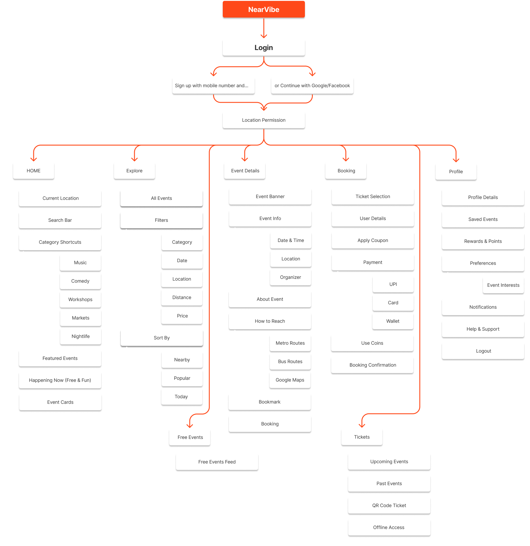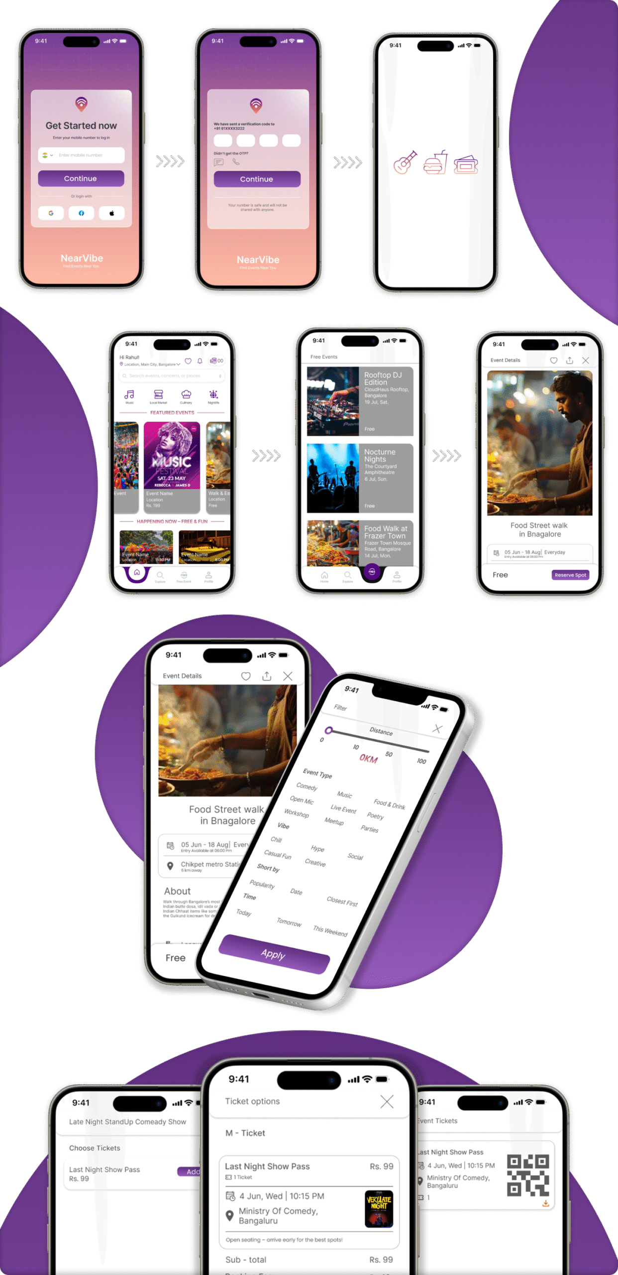 This project was created as part of my assignment, where I aimed to make event discovery easy, instant, and location-based. Near Vibe allowed me to combine user research, UX/UI thinking, and visual design to build a complete digital product that helps users effortlessly find nearby events and make their weekends more exciting and meaningful.