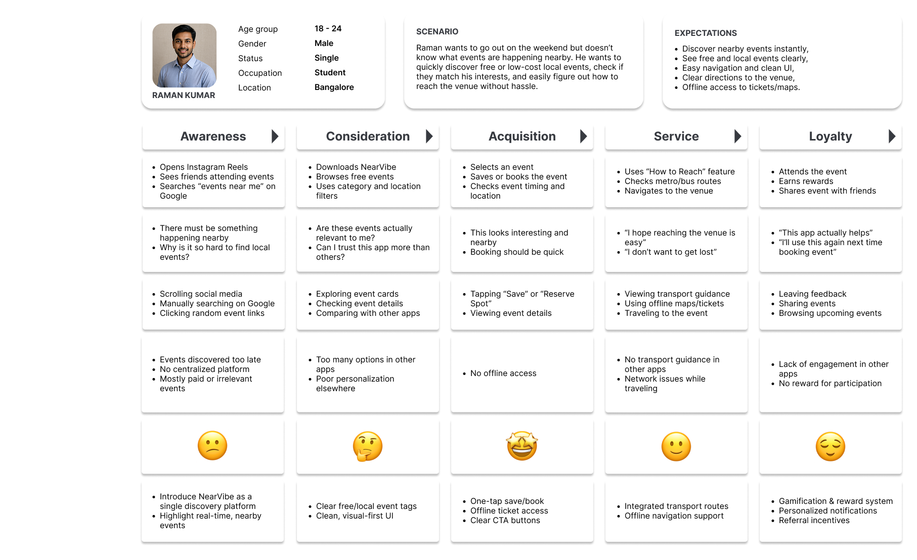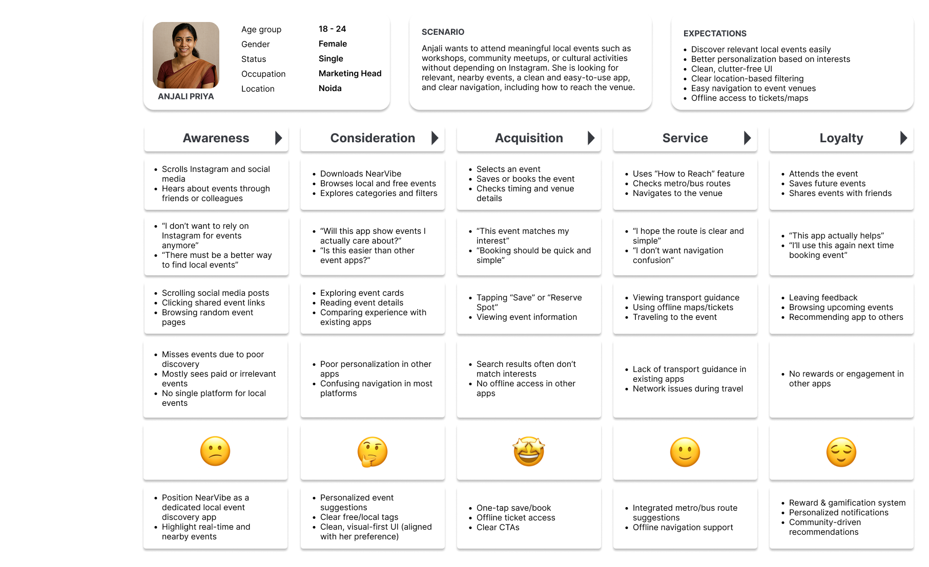 The user personas section gives a clear overview of the kinds of users NearVibe has, their behaviors, demographic information, and pain points when trying to find events around them. These insights show important motivators and frustrations, allowing for design decisions that let NearVibe provide an intuitive, relevant, and user-centered event discovery experience.